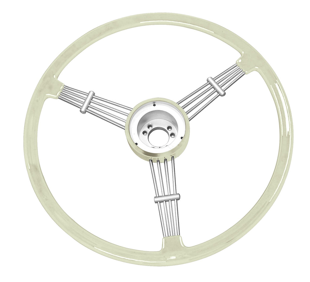 Vintage 3 spoke 15 1/2" Banjo style steering wheel, available in Black or Silver / Grey. Finger grips are on the under-side. Supplied with horn button. Must purchase a boss kit to complete installation (P/N 79-4062 or 79-4063).