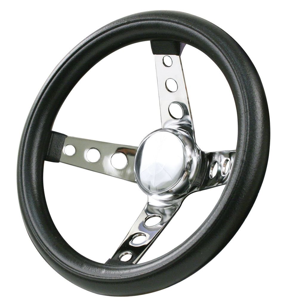 Black foam cushion grip with chrome spokes. Adapters are available to install steering wheels on various VW models. All of these steering wheels have the 3-hole flange. The standard 3 bolt pattern is the same as our P/N: 3172 and P/N 16-9567 steering wheel quick disconnects and P/N: 3177 and P/N 17-2579 steering shafts.