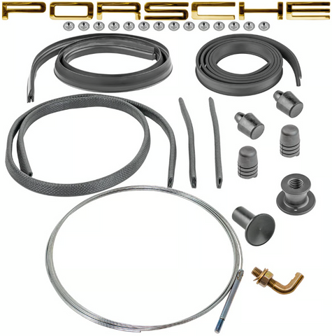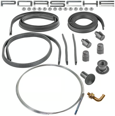 This kit includes all necessary rubber seals: welting (Part #91450410510, #91450410710, #91450410810) to isolate the grille from the body and deck lid, a rear window-to-deck lid seal (Part #91451231910) to block water, edge protection strips (Part #91450411110, one long, two short), two deck lid buffers (Part #91455925310), and two adjustable rubber stops (Part #99970303650). Each component is a high-quality reproduction, UV-resistant, and designed for durability.